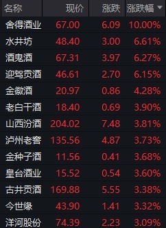 在板块估值优势明显以及中秋旺季将至等利好因素的叠加下,A股白酒股盘中进一步拉升。其中,舍得酒业涨停,水井坊、迎驾贡酒涨超6%,金徽酒、山西汾酒涨超4%,泸州老窖涨超3%,老白干酒、今世缘、古井贡酒、五粮液、酒鬼酒、金种子酒、洋河股份、皇台酒业涨涨超2%,贵州茅台涨超1%。